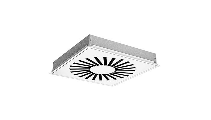 RS15 ist ein quadratischer Dralldurchlass mit verstellbaren Lamellen für Zu- und Abluft. Der Durchlass hat eine hohe Induktion und gewährleistet einen schnellen Temperaturausgleich sowie einen schnellen Abbau der Strahlgeschwindigkeit. Der Durchlass ist daher ideal für die horizontale Zufuhr von sehr kalter Luft. Er kann auch auf vertikale Luftzufuhr eingestellt werden, was die Zufuhr von Warmluft ermöglicht.