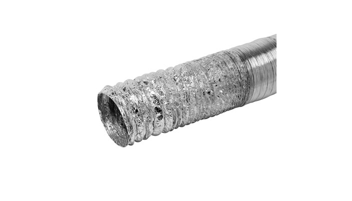 Flexschlauch bestehend aus mehrlagigen Aluminiumlaminat, verstärkt durch eine Drahtspirale.