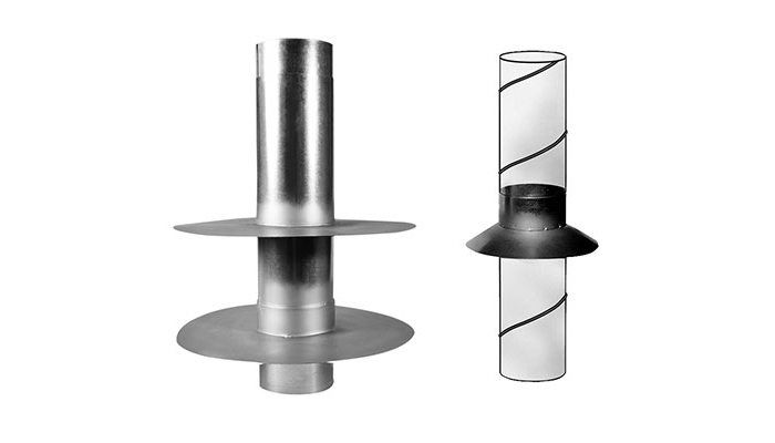 Die Dachdurchführung besteht aus einem Standrohr, mit einer runden Grundplatte. Die Grundplatte ist an das Standrohr gepunktet und mit Dichtmasse abgedichtet. Zum Lieferumfang gehört ebenfalls eine verschiebbare Topplatte mit 250 mm langem Rohrstutzen. Die Topplatte ist an den Rohrstutzen gepunktet und verlötet. Sie wird auf die Isolierung aufgesetzt. Die Schweißnähte der Bauteile sind mit Zinkspray nachbehandelt.