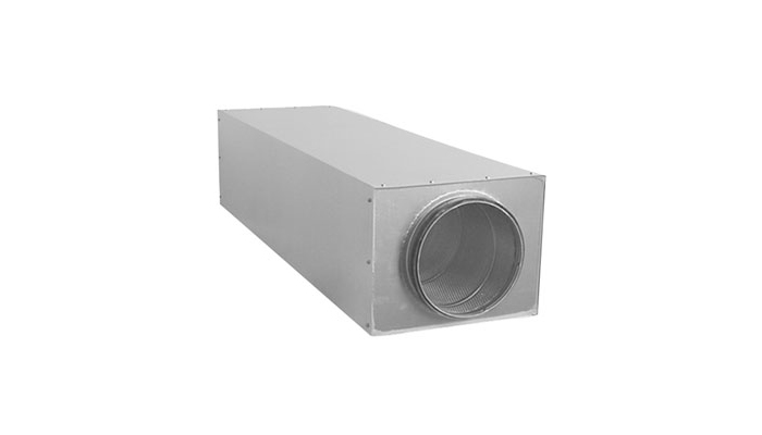 Eckiger Schalldämpfer mit runden Anschlüssen, niedrige Bauweise.