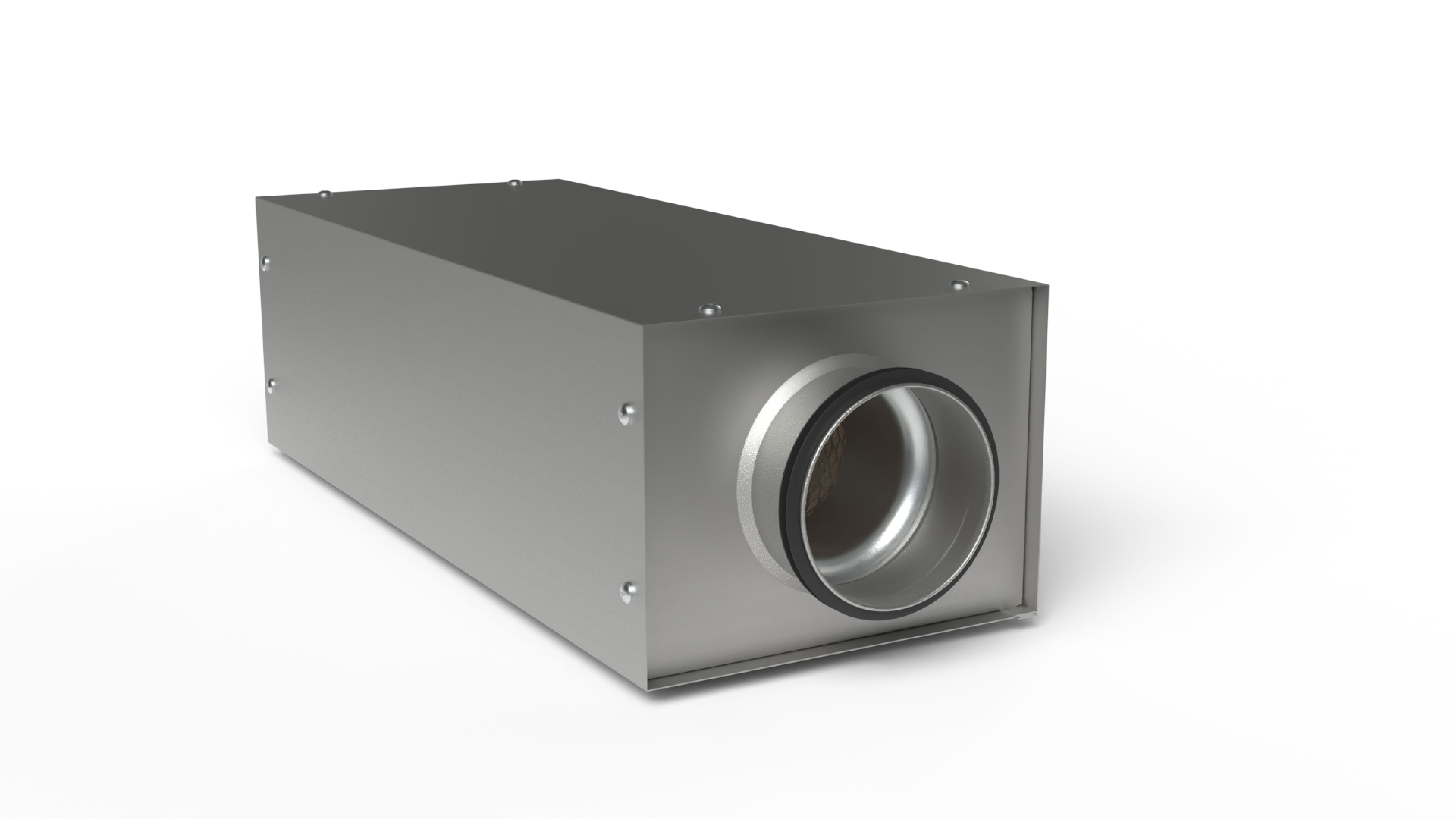 Rechteckiger Schalldämpfer mit runden Anschlüssen.