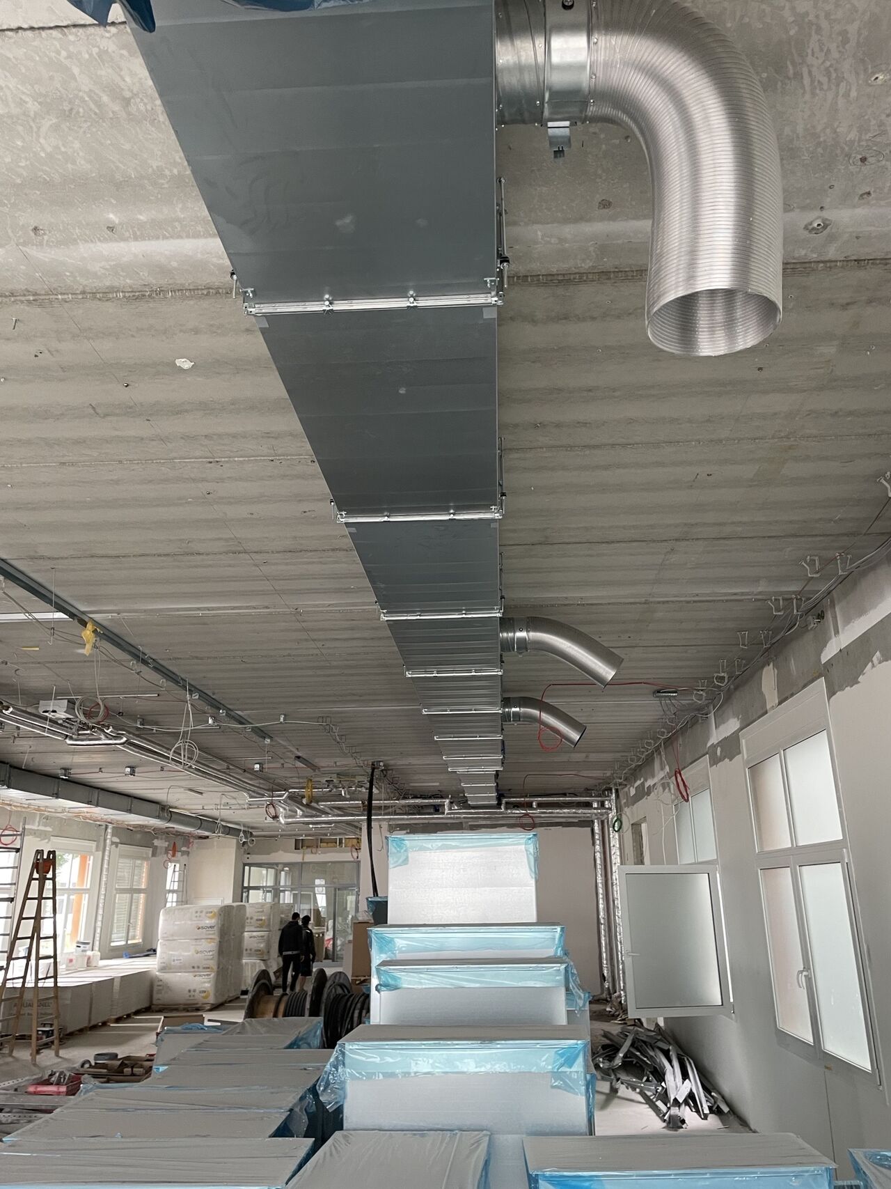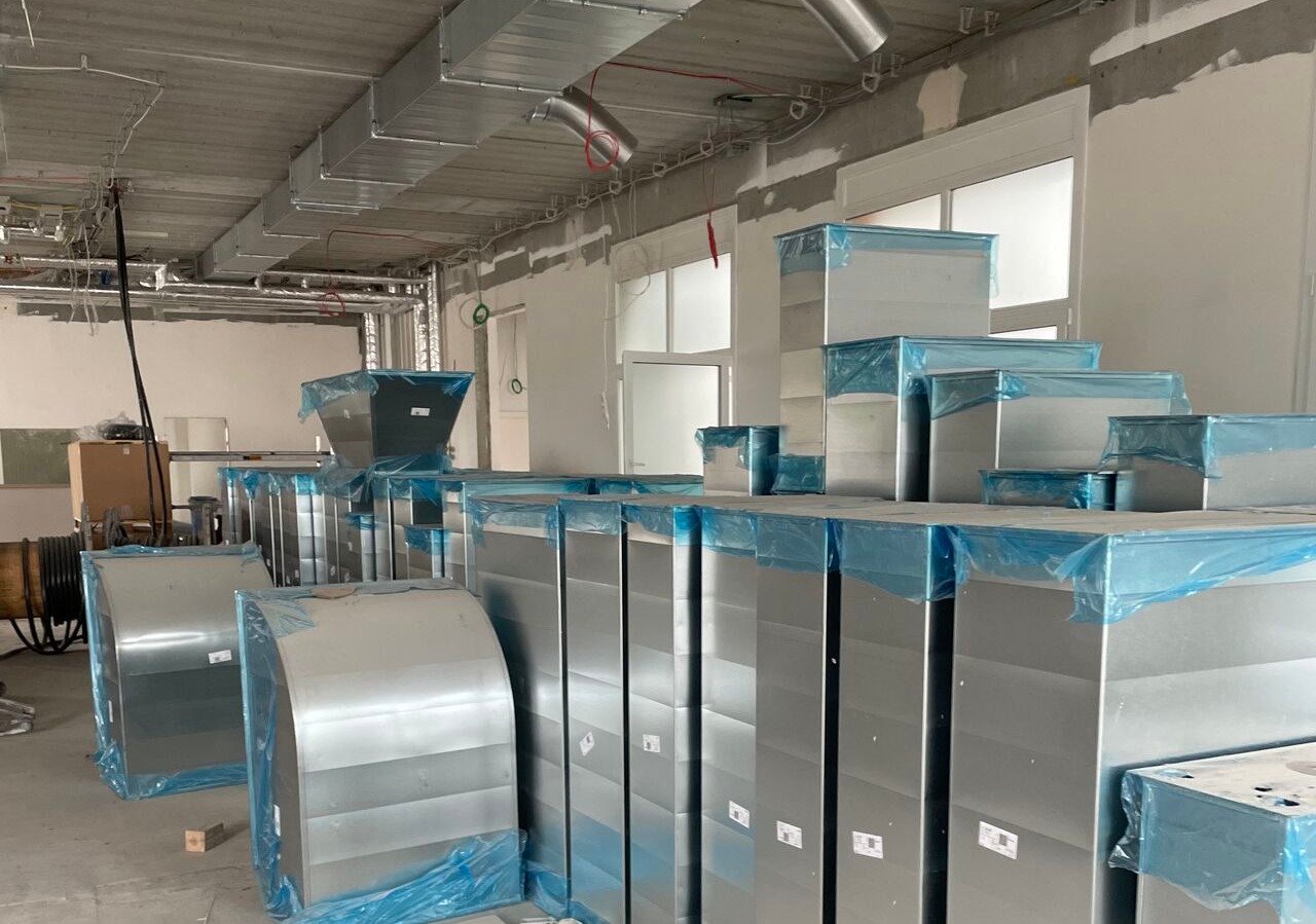 Die Umsetzung profitierte von der CADvent-gestützten Planung: Leitungswege, Übergänge und Einbausituationen konnten vorab sauber festgelegt und auf der Baustelle zielgerichtet umgesetzt werden. Kanal- und Rohrnetz wurden abschnittsweise montiert, die Volumenstromregelung über UltraBT FTCU integriert und die Unterrichtsräume mit RS16-H für eine komfortable Strömung ausgestattet. Parallel wurde die Küchenabluft in robuster Ausführung realisiert, inklusive fettdichter Verkittung großer Anlagenteile. Das Ergebnis ist eine praxistaugliche, effizient betriebene Anlage – bereit für den Schulstart.