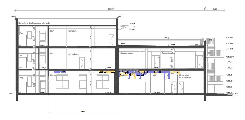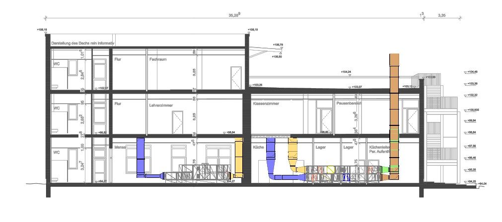 Bei einer Umnutzung zur Schule treffen unterschiedliche Anforderungen aufeinander: Unterrichtsräume brauchen eine zugfreie, gleichmäßige Raumströmung, während Küchenbereiche hohe Betriebssicherheit und robuste Ausführung verlangen. Gleichzeitig müssen Leitungsführung und Platzverhältnisse im Bestand effizient gelöst werden – inklusive sauberer Abstimmung zwischen Planung und Ausführung. Besonders kritisch: Küchenabluft muss dauerhaft zuverlässig funktionieren, weshalb große Anlagenteile fettdicht verkittet ausgeführt wurden. Entscheidend war deshalb ein durchgängiger Planersupport, der technische Details früh fixiert und die Umsetzung absichert.