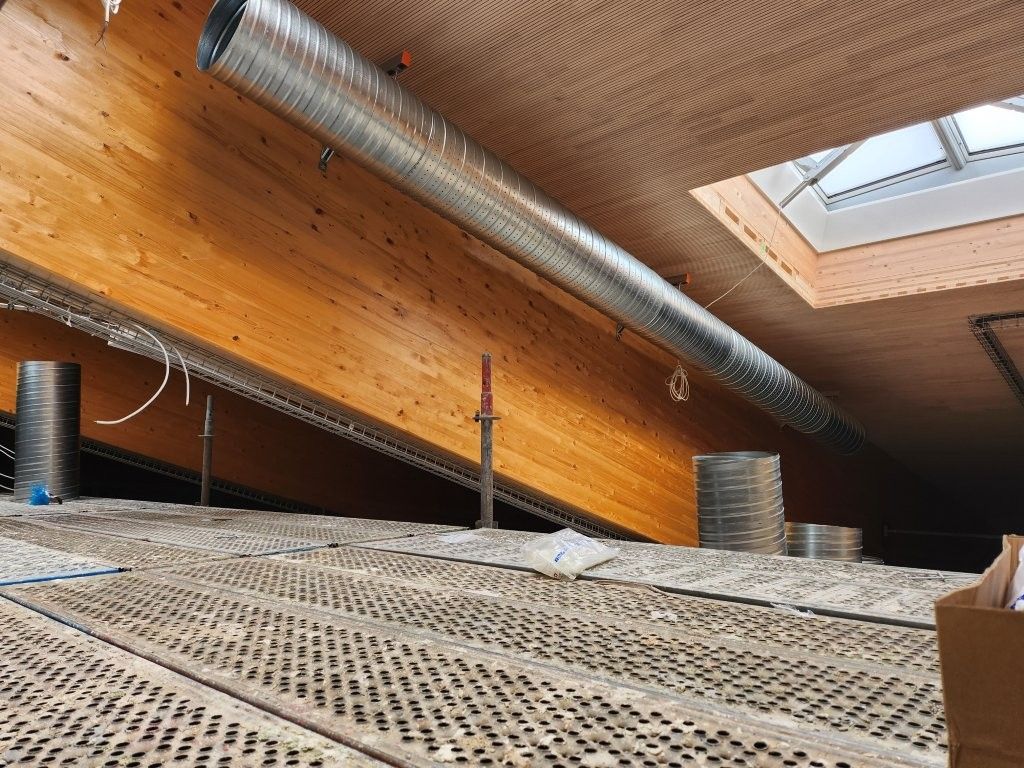 Die Umsetzung erfolgte mit Fokus auf eine saubere Sichtinstallation und eine sichere Montage in großer Höhe. Bereits während der Bauphase wurden Ventiduct-Komponenten vorkonfektioniert angeliefert, zwischengelagert und abschnittsweise über Gerüstebenen eingebracht. Die Montage wurde so organisiert, dass Leitungsführung, Aufhängungen und Deckenbild präzise zusammenpassen. Anschließend erfolgte die Einbindung der FTCU UltraLink-Regelung sowie die akustische Optimierung über den SLKNU-Abluftschalldämpfer. So entstand eine Anlage, die technisch zuverlässig arbeitet und visuell ruhig wirkt.