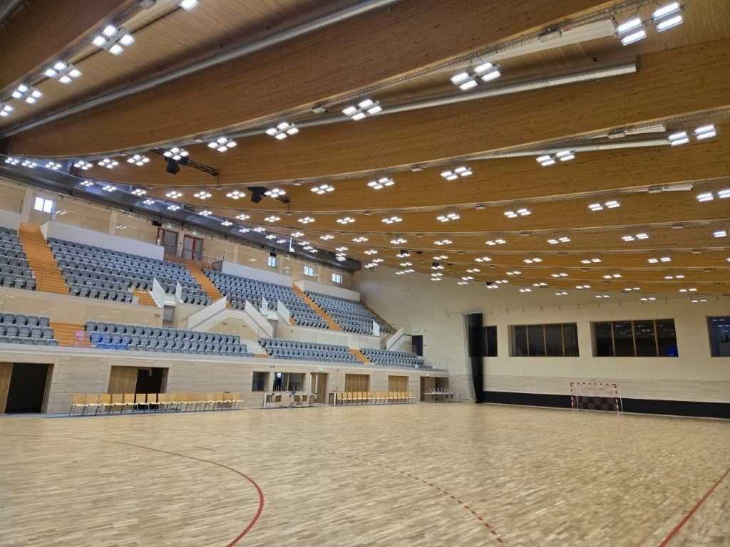 Die Sport- und Veranstaltungshalle wurde als multifunktionaler Ort für Sportbetrieb, Events und Zuschauerbetrieb umgesetzt. Große Raumvolumen, hohe Decken und wechselnde Belegungen stellen besondere Anforderungen an Luftführung, Akustik und Energieeffizienz. Gleichzeitig war eine Sichtinstallation gewünscht, die sich harmonisch in die Architektur einfügt. Lindab realisierte dafür eine Lüftungslösung mit Ventiduct-Düsenrohren, kombiniert mit intelligenter Regelung über FTCU UltraLink. So können Luftmengen flexibel an den Bedarf angepasst werden – bei hoher Behaglichkeit im gesamten Hallenbereich.
