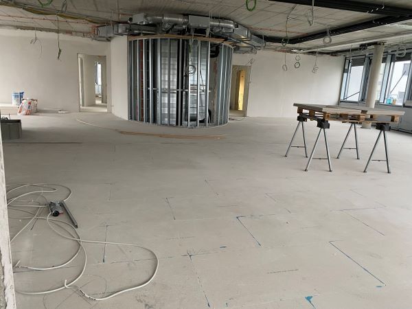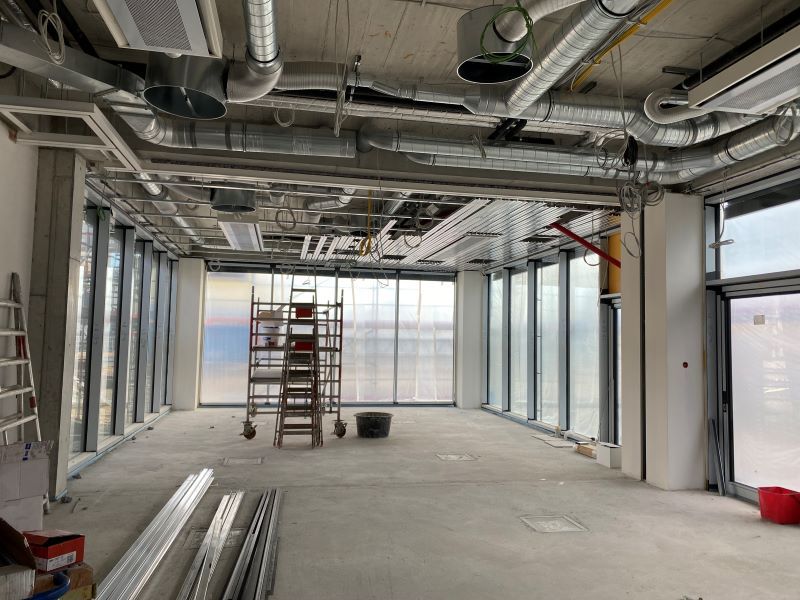 Die Umsetzung erfolgte in enger Abstimmung mit den Ausbaugewerken – besonders im Bereich der Zwischendecken und der gebäudeprägenden Ellipsen-Geometrie. Durch eine strukturierte Leitungsführung und die Auswahl kompakter, leistungsstarker Komponenten konnten die knappen Bauraumreserven eingehalten werden. Kanal- und Rohrnetz wurden abschnittsweise montiert, Brandschutz und Akustik elementweise integriert und die Heiz-/Kühldecke mit den ProfessorXP gezielt in den Flächenaufbau eingebunden. So ließ sich der Ausbau effizient vorantreiben und sauber dokumentieren.