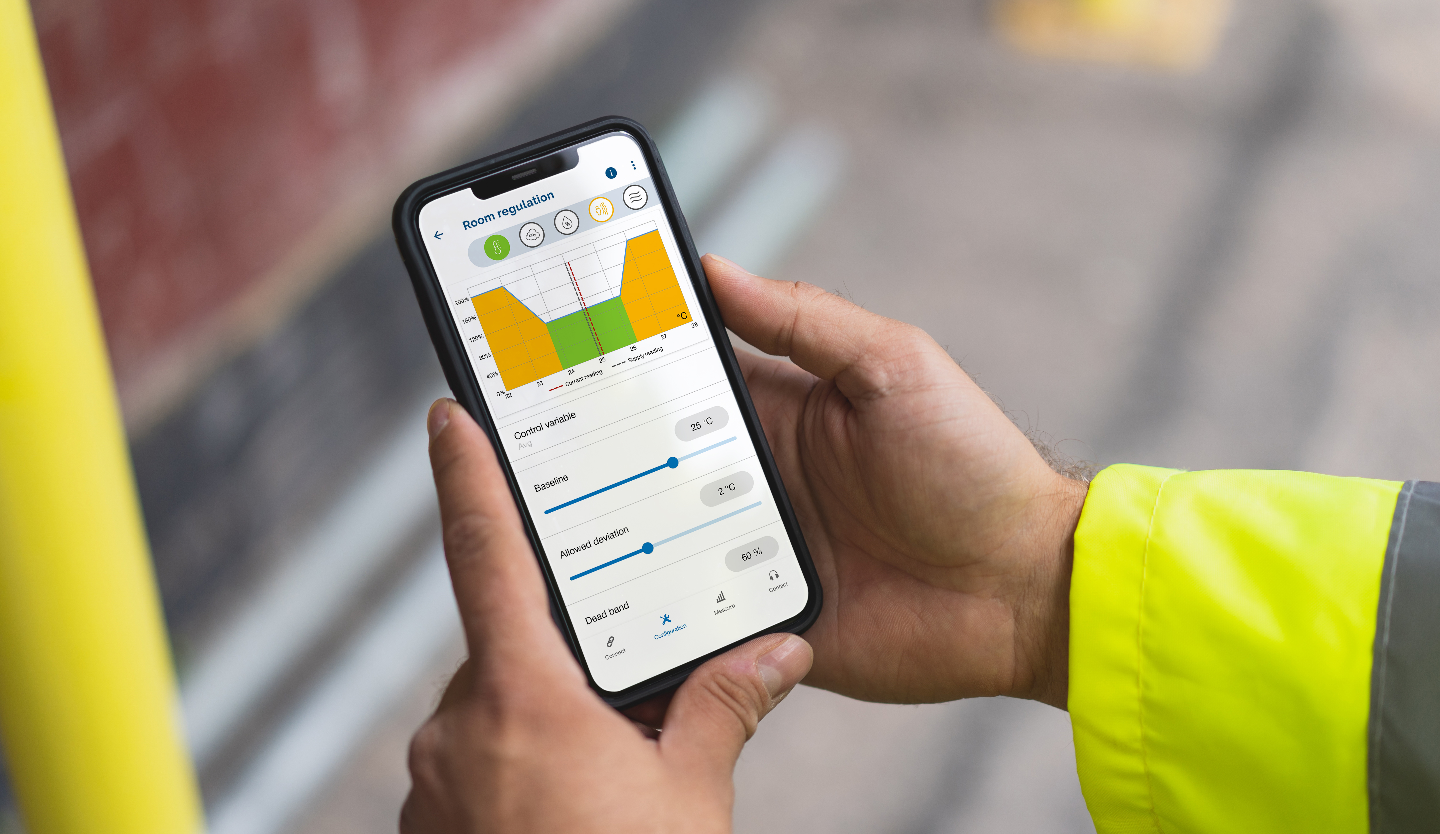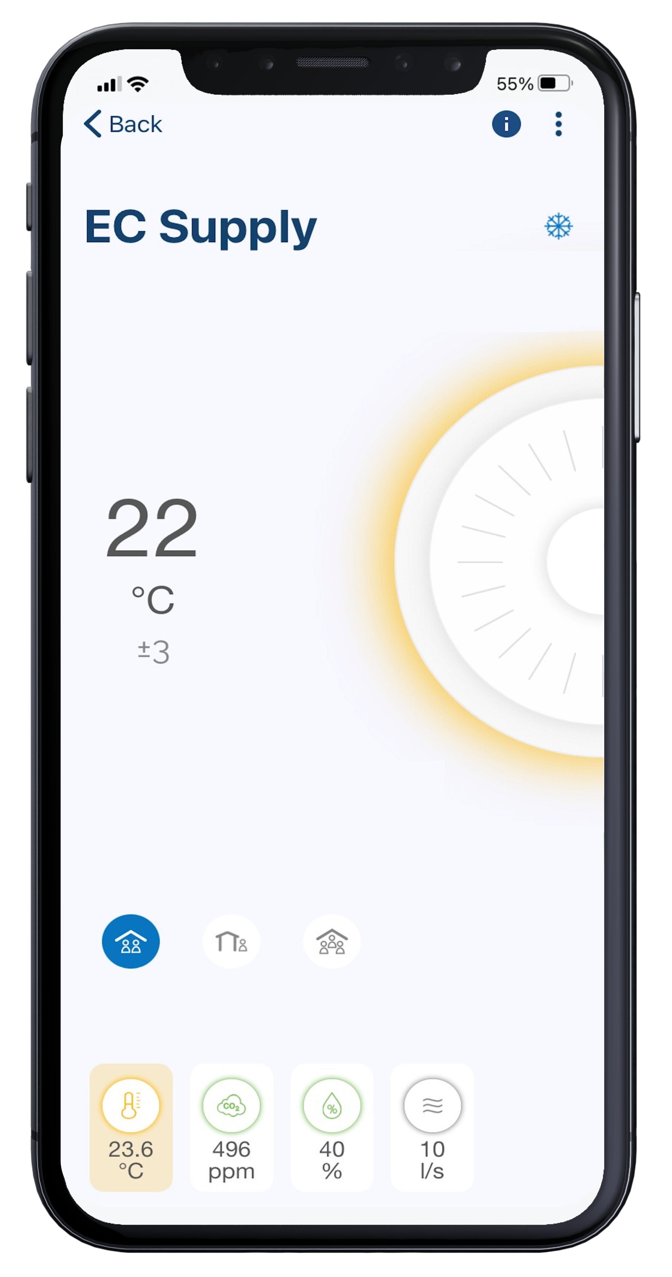 Lindab OneSet ermöglicht den Fernzugriff auf die Lindab Lüftungsprodukte. Die App verbindet sich über Bluetooth mit den im Raum installierten Produkten und Sensoren. So kann der Endanwender Einstellungen entsprechend den spezifischen Bedürfnissen anpassen oder sich direkt vom Smartphone aus einen Überblick über die aktuelle Raumluftqualität auf Raumebene verschaffen.