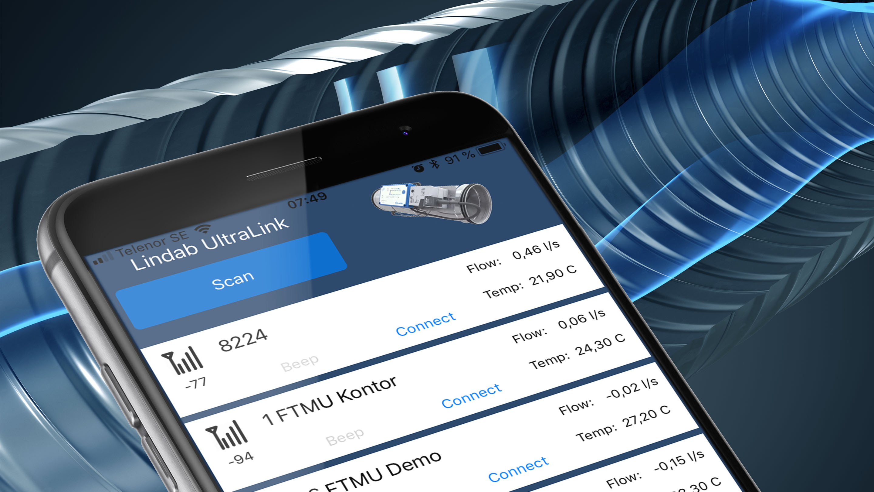 Mit der OneLink-App haben Sie Ihr Inbetriebnahme-Setup stets in in der Tasche dabei. Installieren und steuern Sie die UltraLink Volumenstromregler über Ihr Smartphone mit der OneLink-App.